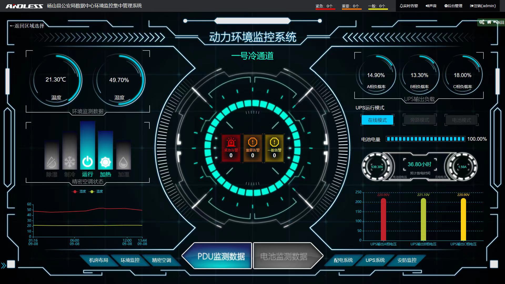 用戶使用3套安德力士的雙排冷通道,包含UPS不間斷電源系統(tǒng)、精密空調(diào)系統(tǒng)、環(huán)境檢測系統(tǒng)、配電系統(tǒng)、PDU監(jiān)測系統(tǒng)以及一套環(huán)境監(jiān)控集中管理系統(tǒng),設(shè)備現(xiàn)已安裝調(diào)試完成。機(jī)房建設(shè)使用1套UPS電源為數(shù)據(jù)中心機(jī)房IT設(shè)備提供后備電源保障,機(jī)房使用12臺行間空調(diào)為IT設(shè)備提供一個(gè)恒溫恒濕的良好運(yùn)行環(huán)境。碭山縣公安局此次招標(biāo)采用我公司全套的安德力士UPS電源,產(chǎn)品包含安德力士GLS180KVA模塊機(jī)一臺、安德力士12V200AH電池320只以及電池柜、配電柜等輔材。