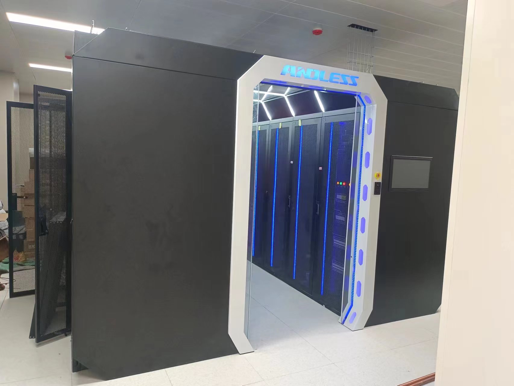 結(jié)合國家(三亞)隔檢中心項目機房情況,本次為其配置提供一套雙排冷通道微模塊系統(tǒng),現(xiàn)已安裝調(diào)試完成。