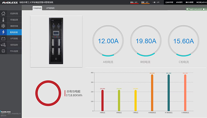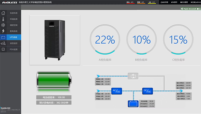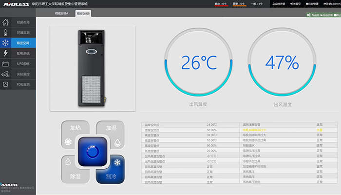 本次為阜陽理工學(xué)院提供配置的設(shè)備是安德力士品牌UPS不間斷電源主機(jī)、穩(wěn)壓器、及動力環(huán)境監(jiān)控系統(tǒng)一套,本次主要針對機(jī)房精密空調(diào)、漏水、煙感進(jìn)行監(jiān)控管理。