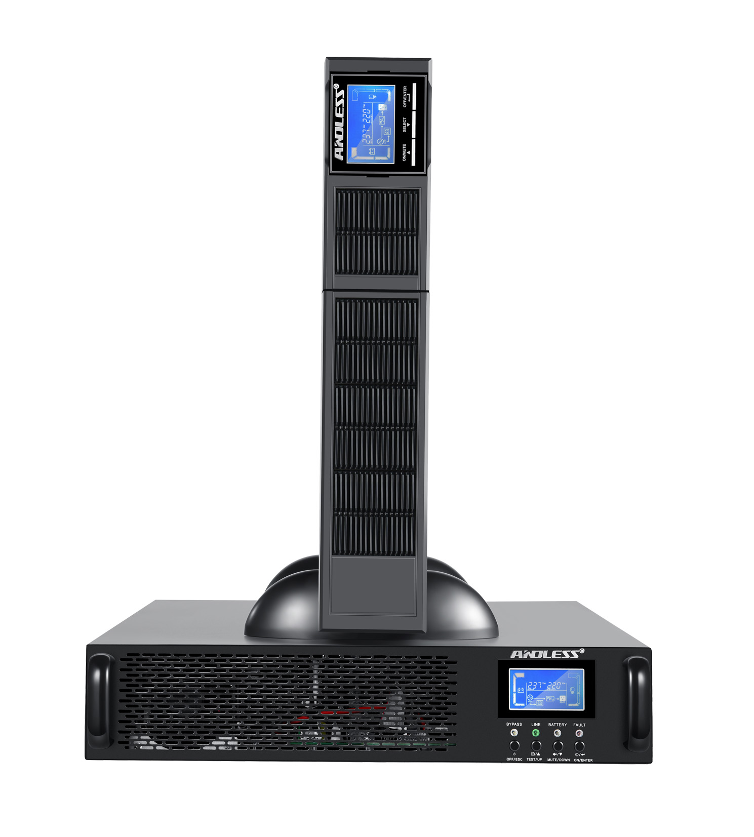 具有UPS交流輸入過、欠電壓保護,UPS輸出短路、過溫度、電池電壓低、輸出過欠壓、風(fēng)扇溫控智能等保護及故障報警功能,電池自檢測試功能,具有軟啟動功能